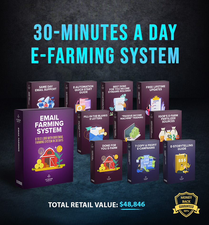 Do you go to school to acquire a new skill like HVAC or something? Do you go back to college? Let’s be honest. It’s either too expensive or too late. You’ve got a real chance with e-Farming. Try it, you’ve got nothing to lose because I’m backing you up by a 30-day guarantee.